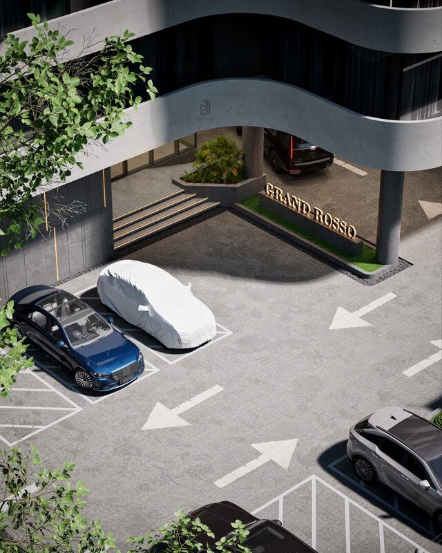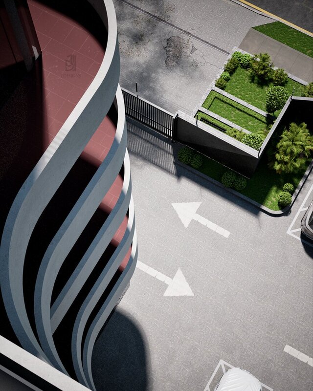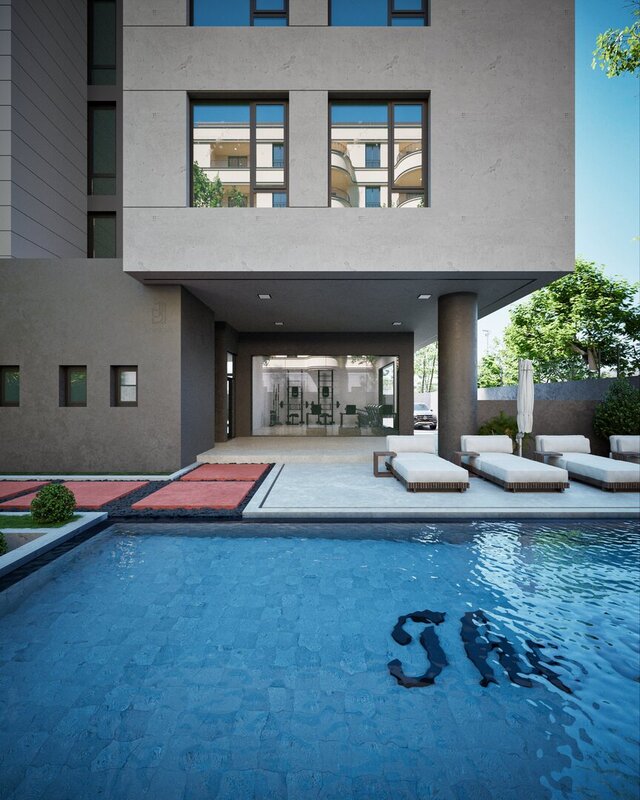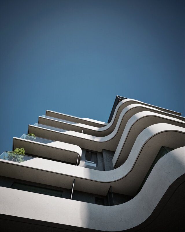 A photorealistic visualization of a large-scale residential apartment building. This project showcases expertise in modeling complex, rhythmic facades, creating highly realistic board-formed concrete textures, and producing atmospheric visuals for large urban development projects.
