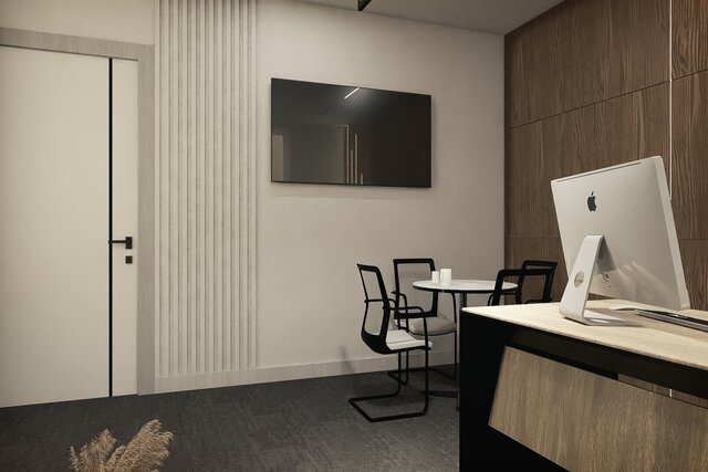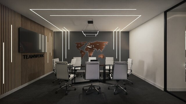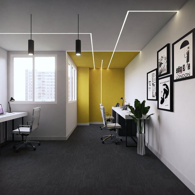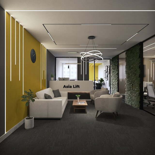 This project is the interior design of an office designed in a modern style with the corporate colors yellow and gray. The use of linear lighting in the illumination of the space has given the office a modern appearance.