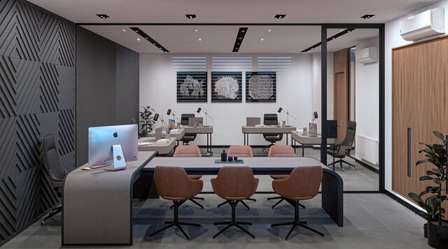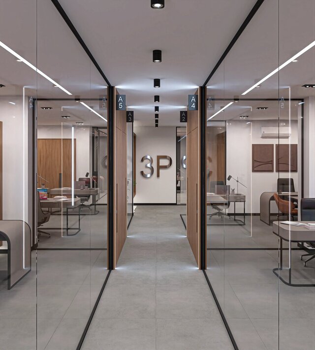 This office interior project was designed with a focus on clarity, functionality, and a clean modern aesthetic. The layout includes an open workspace for teamwork, individual workstations, a central corridor with glass partitions, and private rooms designed for meetings and focused work.