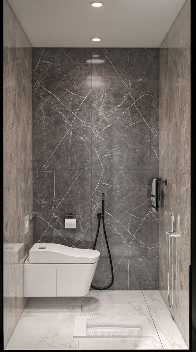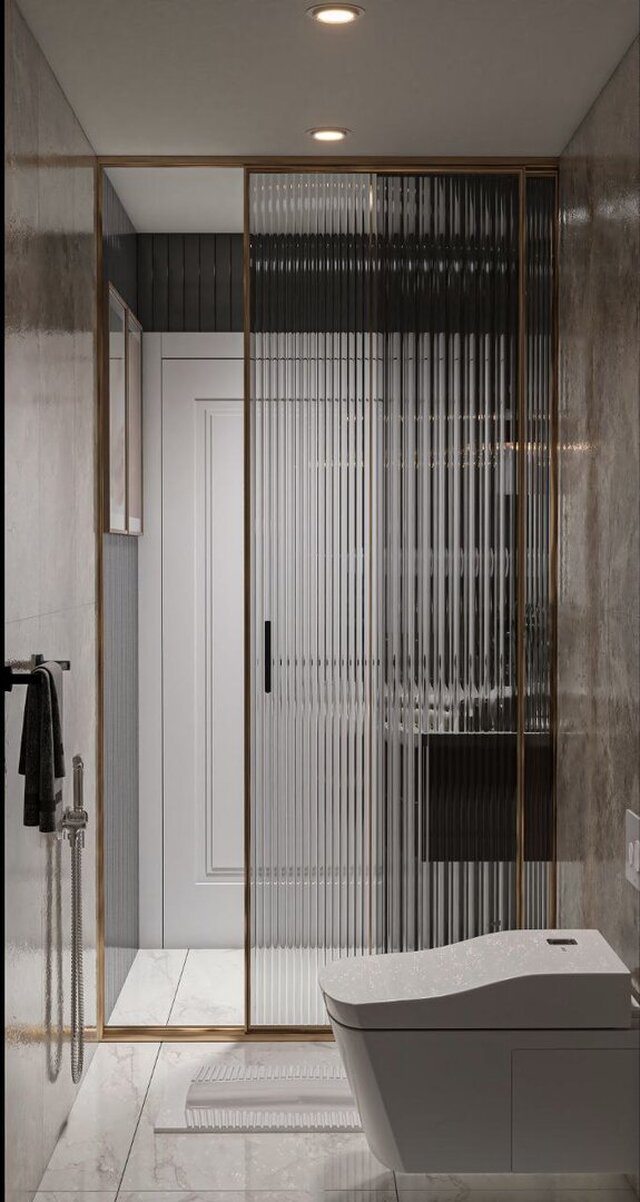 The master suite also includes a contemporary ensuite bathroom designed with marble surfaces, modern sanitary fixtures, and warm lighting elements. The bathroom design emphasizes both functionality and aesthetic continuity with the bedroom space.