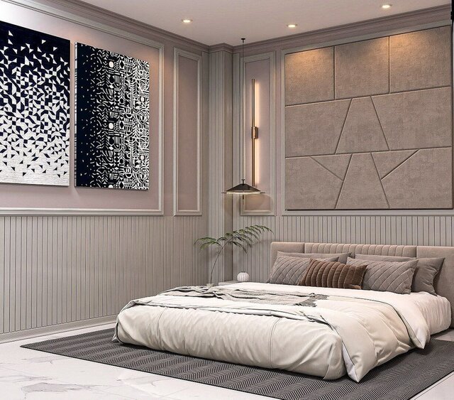 This project presents a modern soft-luxury master bedroom designed to create a calm, elegant, and functional living space. The concept focuses on neutral color palettes, textured wall panels, and warm ambient lighting to establish a relaxing and sophisticated atmosphere.