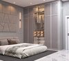 The bedroom layout features a minimalist furniture arrangement, integrated wardrobe lighting, and decorative wall art that enhances visual balance and spatial harmony. Soft materials, subtle textures, and carefully selected finishes add depth and comfort to the overall design.
