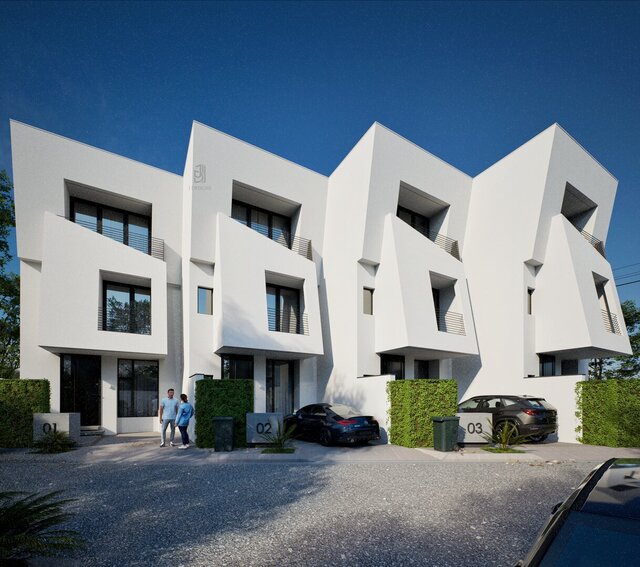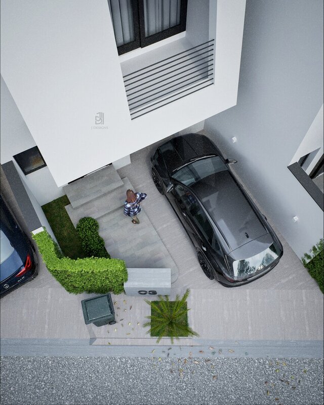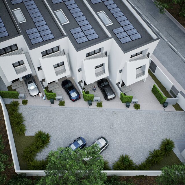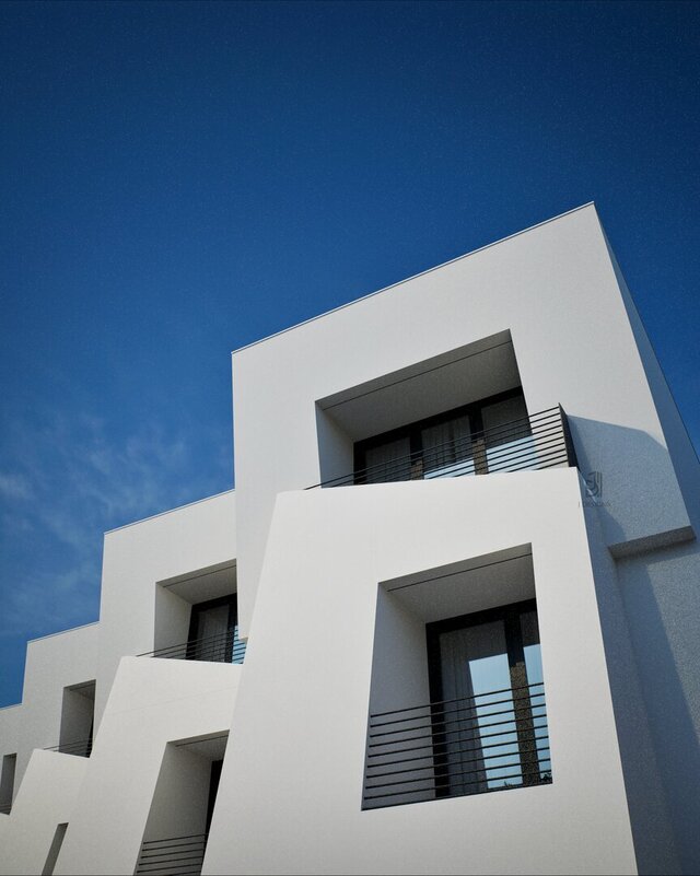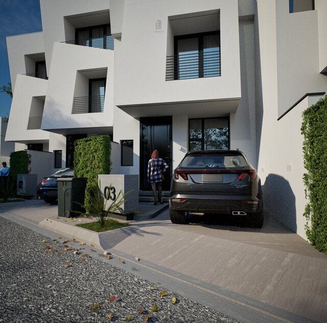 Photorealistic renderings for a multi-unit residential development. This project demonstrates skills in creating cohesive architectural visualizations for real estate marketing, including detailed 3D modeling, realistic material definition (brick, metal, wood), and atmospheric site lighting.