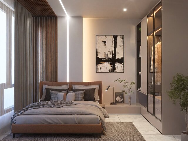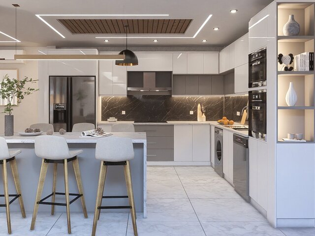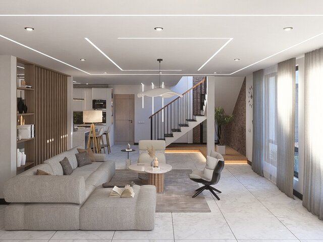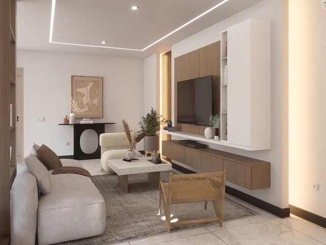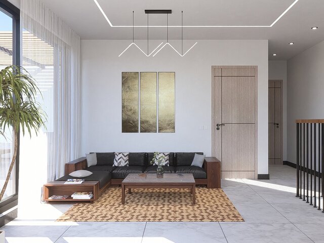 The Black and White Villa Project is a modern and minimalist duplex villa. The interior design follows a modern style with a white and cream color scheme, complemented by touches of brown and natural wood, creating a visually stunning aesthetic. Additionally, due to the use of the building's old structure, two columns were present in the middle of the kitchen and living area. To address this, we incorporated an attractive wooden partition along with a few small shelves, successfully concealing the intrusive columns and transforming a structural weakness into a focal point of the villa's architecture and interior design.