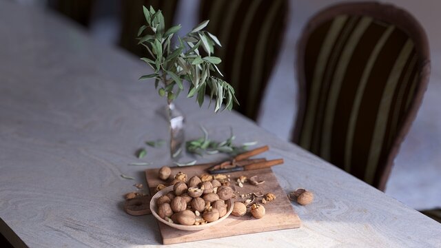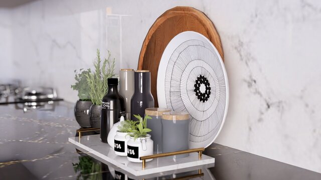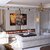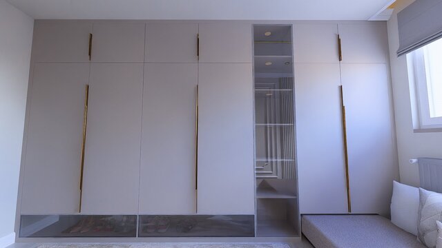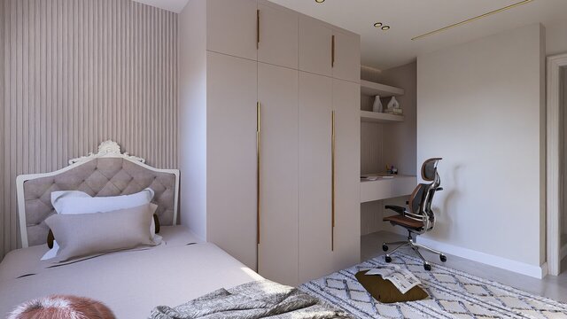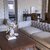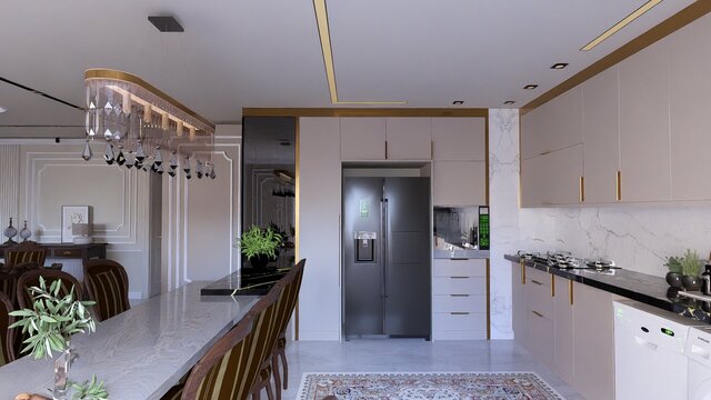 A neo-classical interior design blending modern simplicity with classic elegance. Neutral tones, gold accents, and a crystal chandelier create a bright and luxurious atmosphere.
