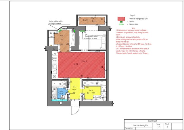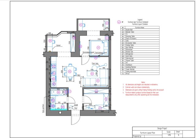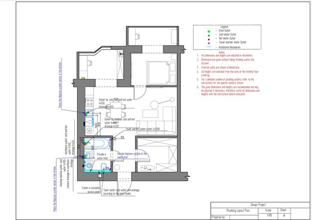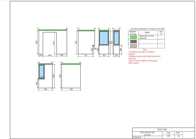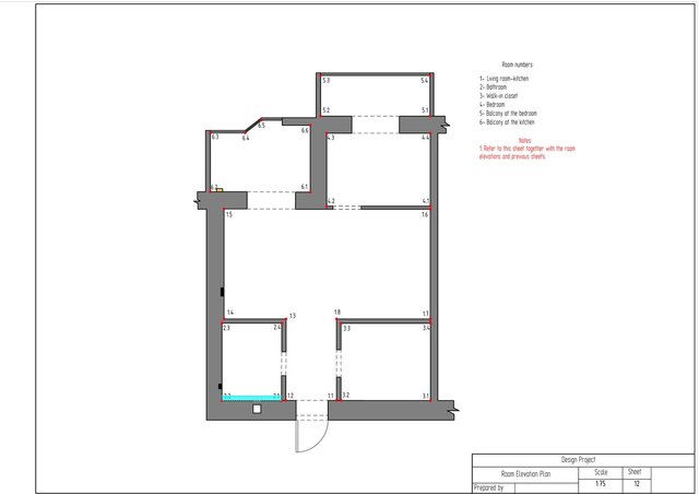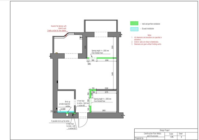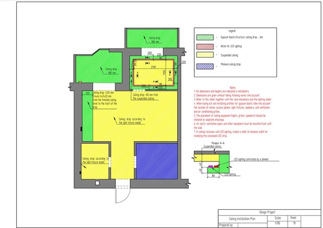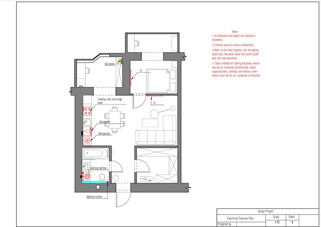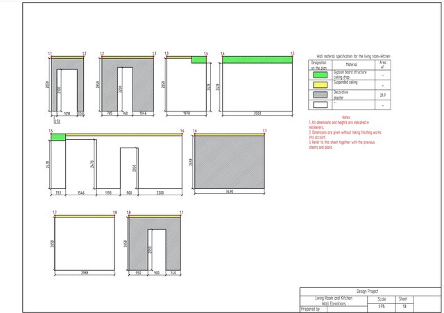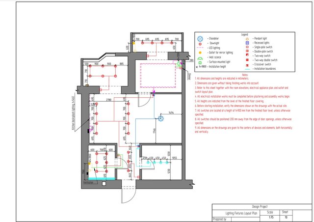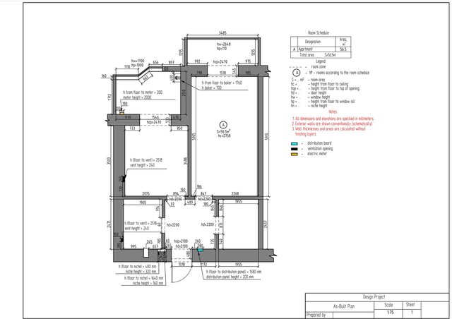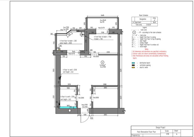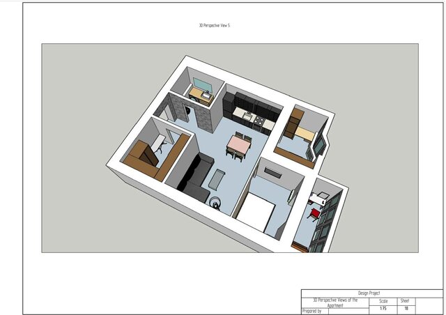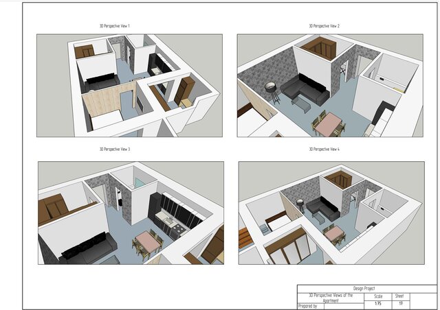 This project is a complete technical design package for a one-bedroom apartment created in ArchiCAD. The drawing set includes measurement plan, demolition and construction plans, post-remodel layout, furniture plan, plumbing layout, floor heating plan, electrical devices plan, outlets and switches plan, lighting layout, ceiling installation plan, and detailed wall elevations for all rooms. The package also contains perspective views of the redesigned apartment.