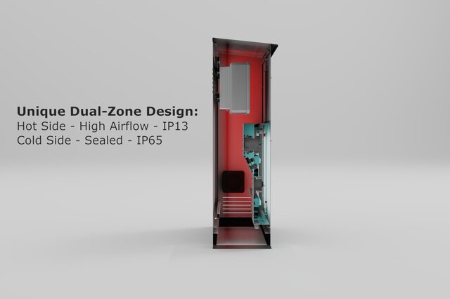 We separated the cabinet into 2 areas, one would be less protected from the elements but feature much higher airflow, allowing for better passive cooling as well as higher air flow rates from the additional fans. The second section would enclose all the AC switchgear, PV Switchgear, coms equipment and remote monitoring equipment and would be rated at IP65 to ensure no water ingress could advance to the sensitive electrical equipment.