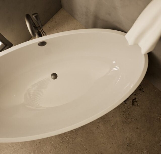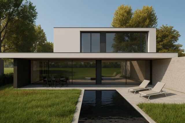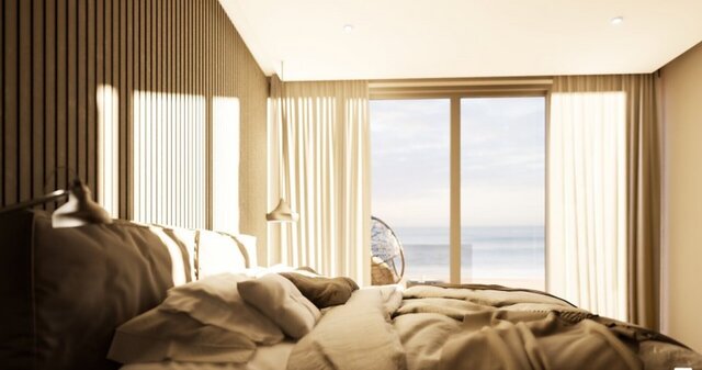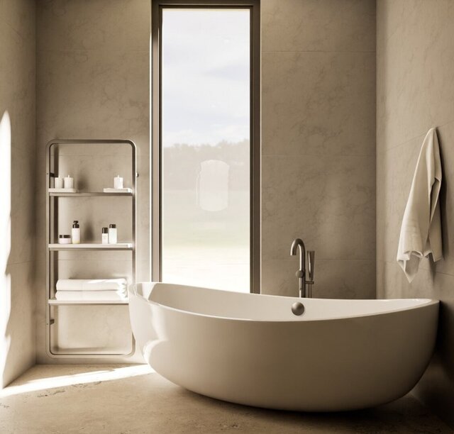 A spa‑inspired bathroom with a freestanding oval tub set against marble and polished concrete, where natural light sculpts soft reflections and shadows. Two earth‑toned bedrooms feature textured wall finishes, warm wood floors and carefully layered lighting—one opening to a panoramic seaside view, the other defined by sculptural wall panels. Finally, a minimalist modern villa overlooks a narrow pool and lush lawn, its clean volumes and large glazing forging a seamless indoor‑outdoor dialogue.