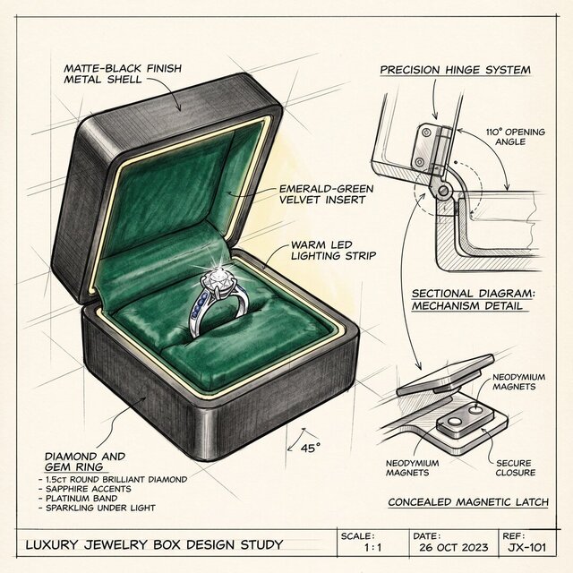 A complete design study showcasing the evolution of a luxury presentation box. This project bridges the gap between engineering specifications and commercial aesthetics. It features a precise 110-degree hinge mechanism, a concealed magnetic latching system, and a custom-designed diamond and sapphire gem ring. From detailed technical sketches to an 8K photorealistic render, this presentation highlights the importance of presentation and experience in high-end jewelry branding.