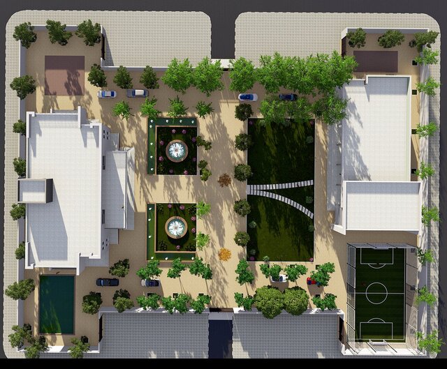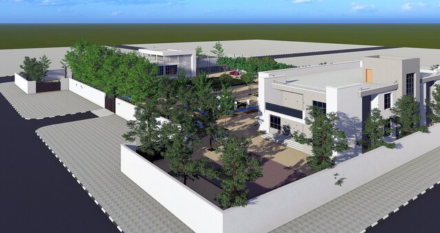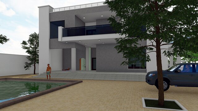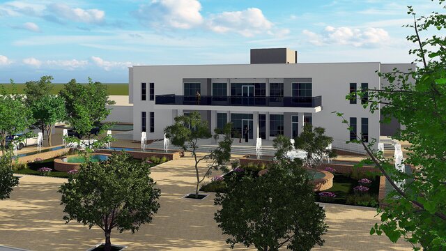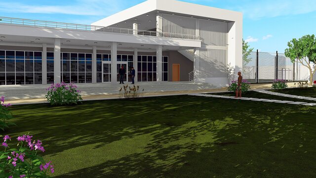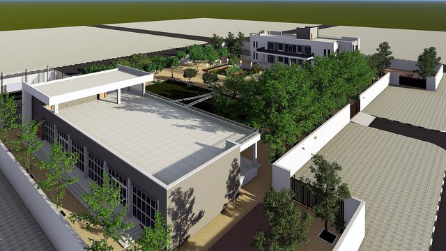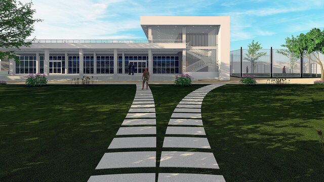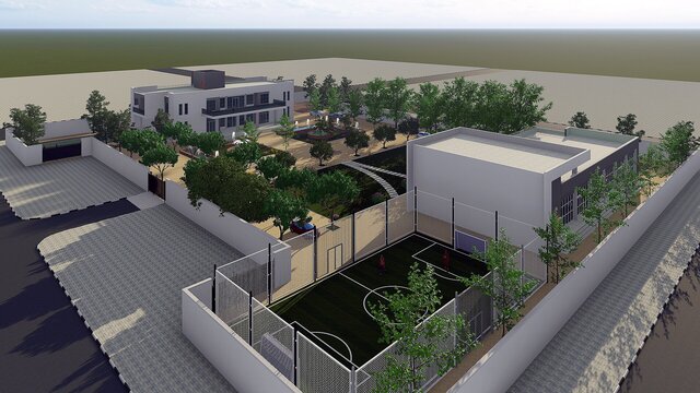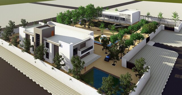 A comprehensive architectural BIM project featuring a contemporary private villa with full site design, developed entirely in Autodesk Revit. The project encompasses the main residential building, ancillary structures, outdoor recreational areas including a multi-purpose sports court, landscaped gardens, paved pathways, and perimeter boundary walls.