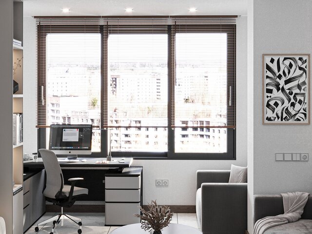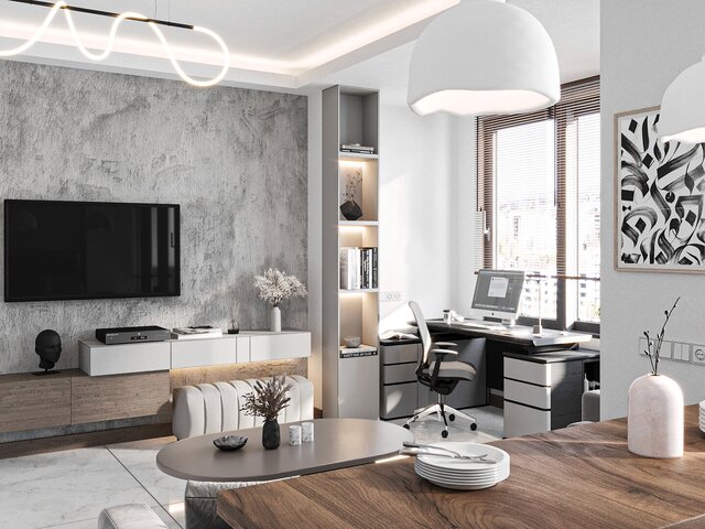 This project is the interior design of a small residential apartment in a modern style. The designed spaces include the kitchen, living room, TV wall, and workspace. The use of a neutral color palette, such as white and gray, has enhanced its simplicity and elegance.