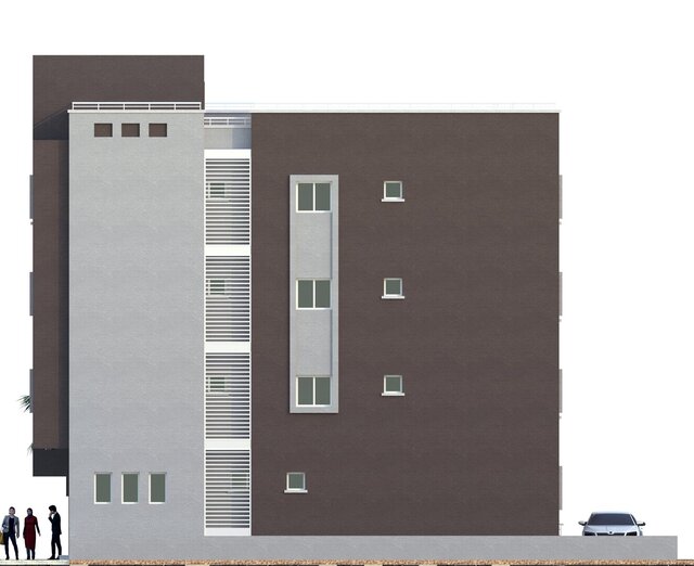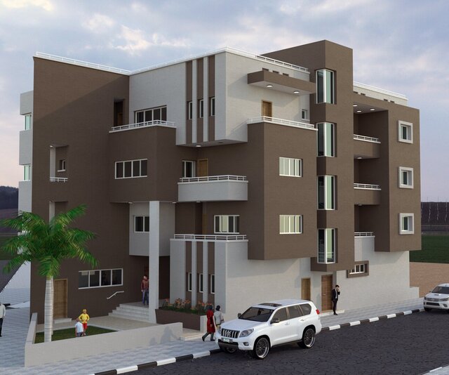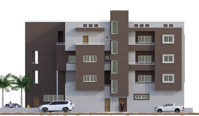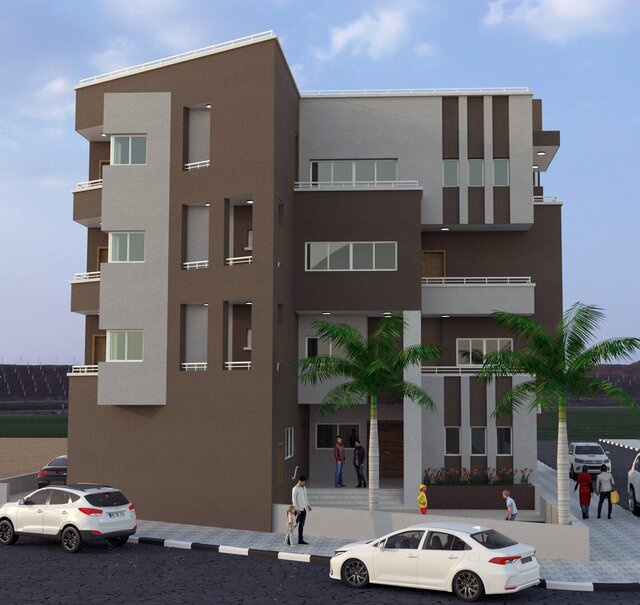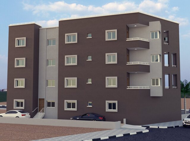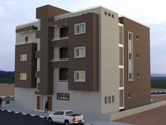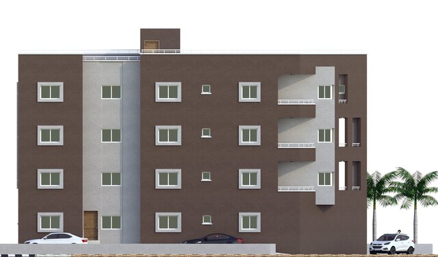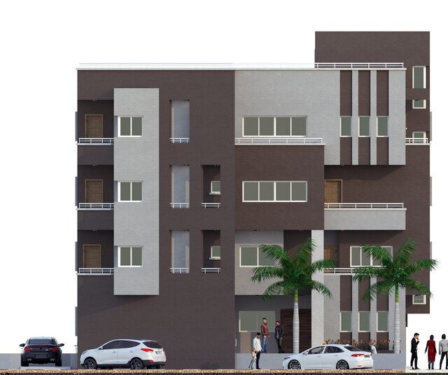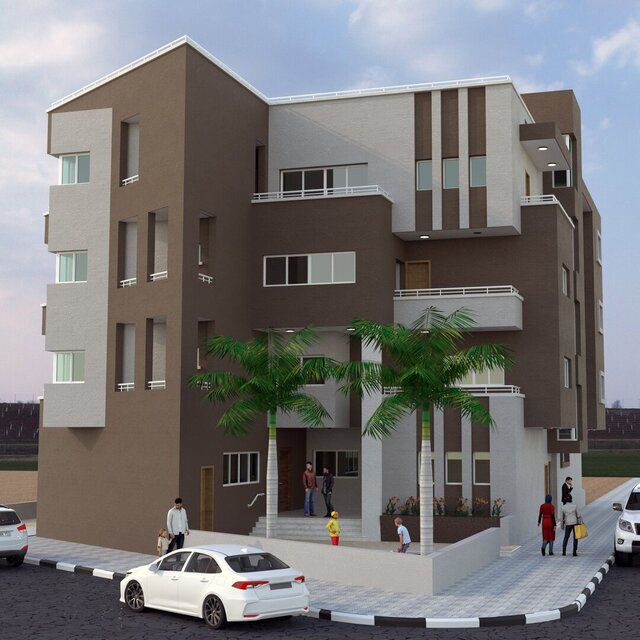 A Ground + 3 Floors residential apartment building fully modeled and documented in Autodesk Revit. The project covers complete architectural BIM modeling including floor plans, elevations, sections, even typical details and schedules — all generated directly from the Revit model. The 3D model was rendered in 3ds Max using Corona Renderer to produce photorealistic exterior visualization.