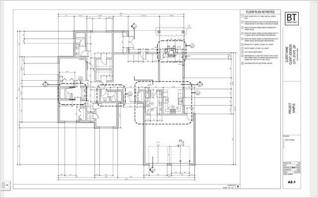This project showcases a complete residential drafting package, including a fully dimensioned floor plan, detailed enlarged views of bathrooms, kitchen, and a fireplace area, a front exterior elevation, and a coordinated roof plan. The work demonstrates accurate layout drafting, clear annotation, multi-scale detailing, and consistent sheet organization, reflecting the core skills needed to produce clean, professional residential documentation.