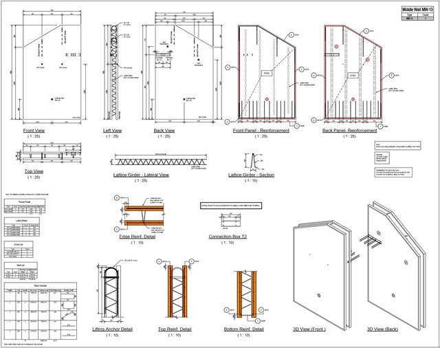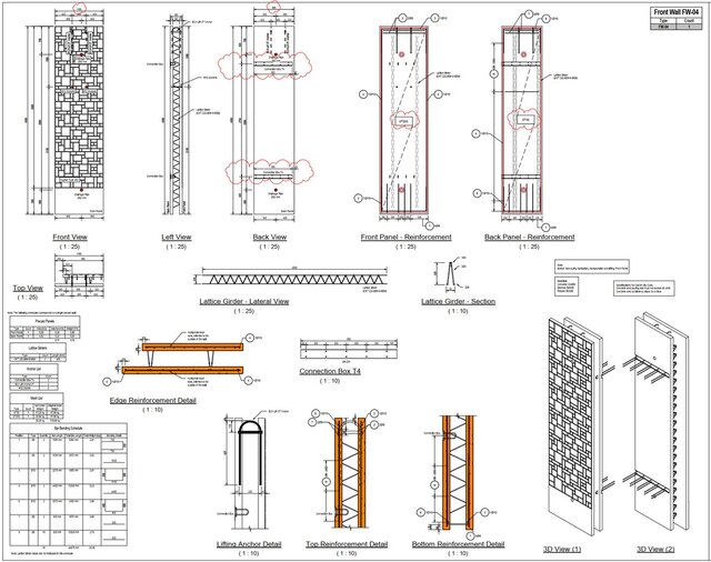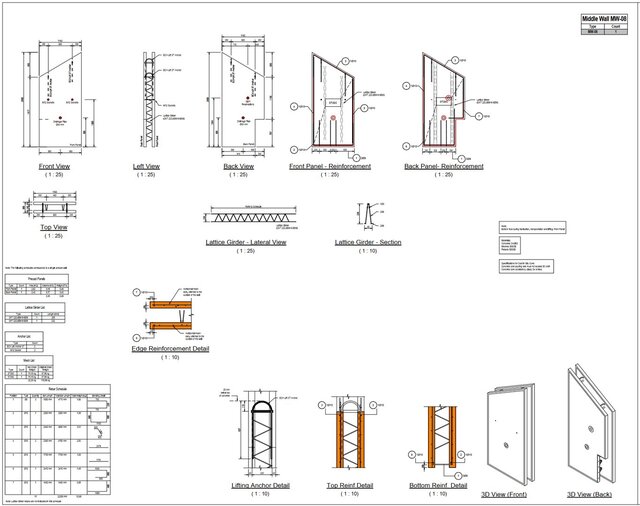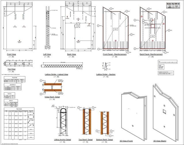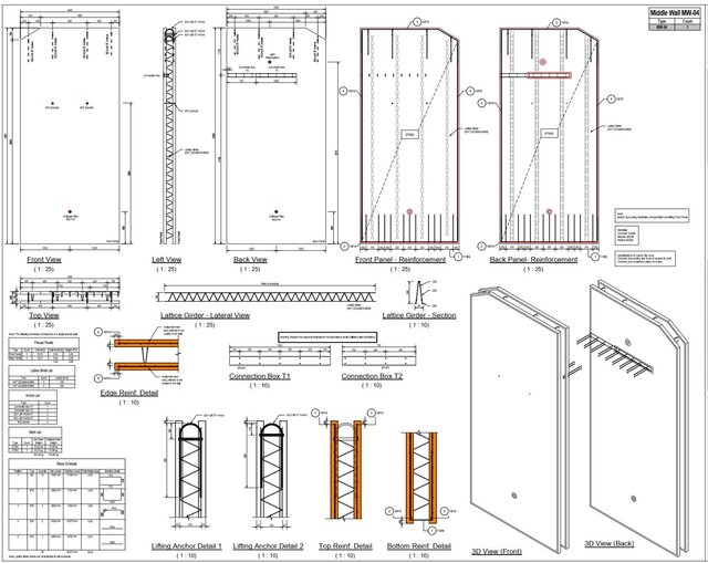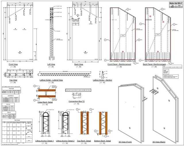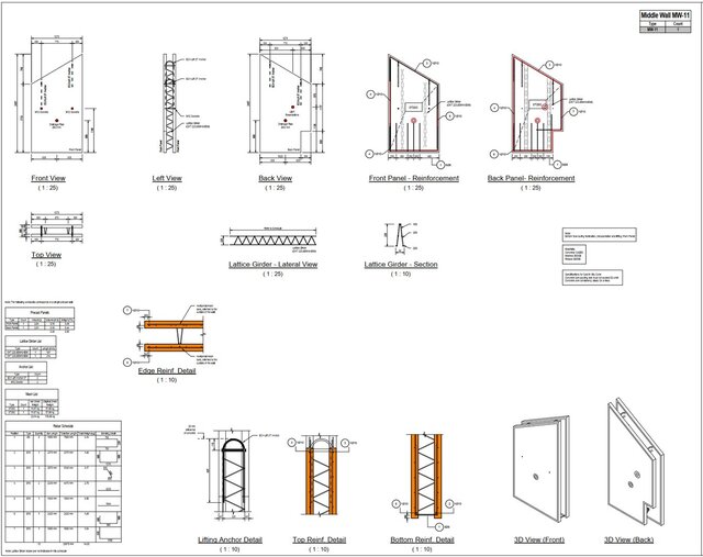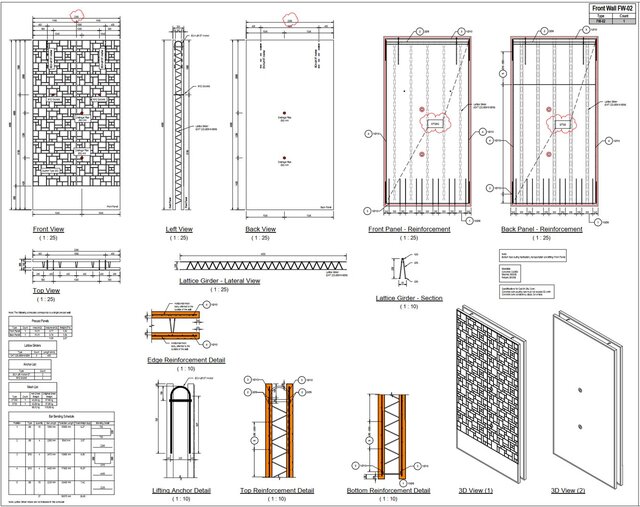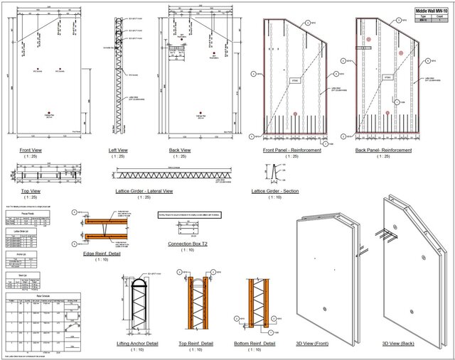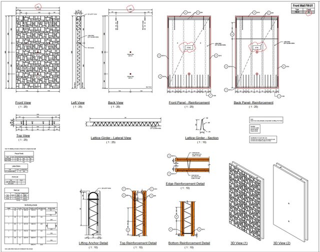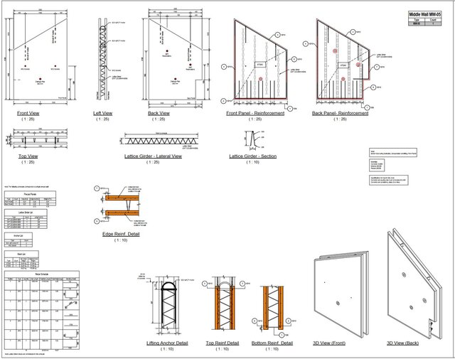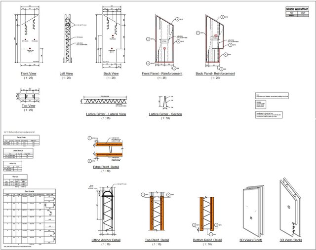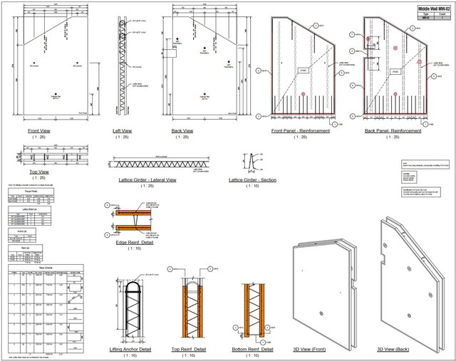Retaining Walls Precast includes the complete detailing package for precast retaining wall units. The scope covers wall geometry, reinforcement layouts, footing connections, joint details, drainage provisions, lifting anchors, embeds, and production-ready schedules. All components are coordinated for factory fabrication and efficient on-site installation.