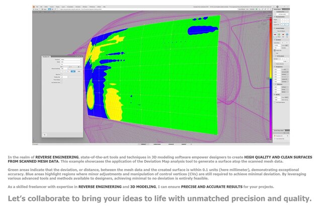 In the realm of REVERSE ENGINEERING, state-of-the-art tools and techniques in 3D modeling software empower designers to create HIGH QUALITY AND CLEAN SURFACES FROM SCANNED MESH DATA. This example showcases the application of the Deviation Map analysis tool to generate a surface atop the scanned mesh data.