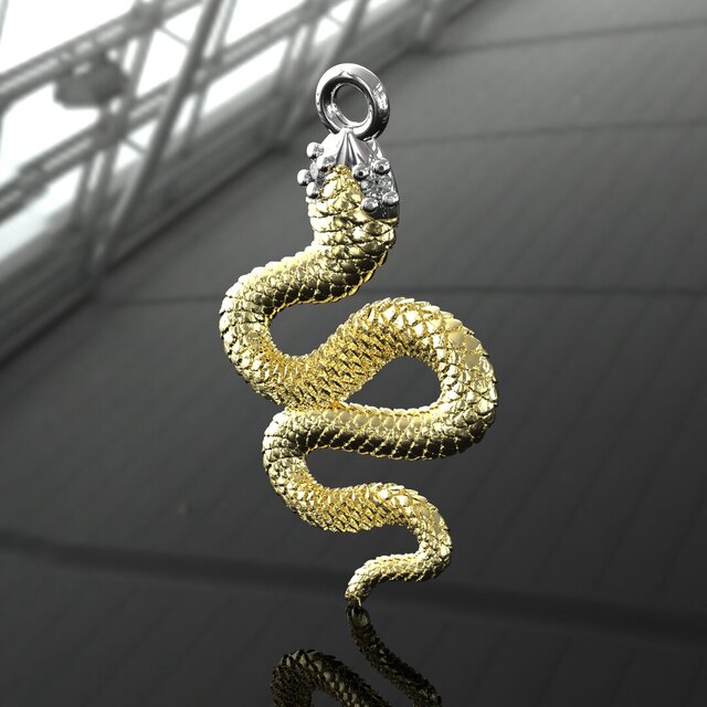 This is a sophisticated 3D jewelry model of a serpentine pendant, designed with a dynamic S-curve silhouette. The piece showcases a stunning contrast between the golden textured body and a polished white gold (or platinum) head assembly.