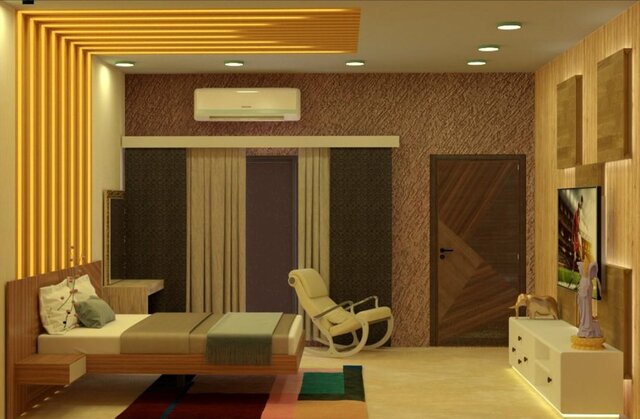 Warm wooden finishes, layered lighting, and subtle textures define the modern bedroom interior, creating a calm and sophisticated ambiance. The client’s goal was to design a comfortable, clutter-free, and visually refined space that reflects their contemporary lifestyle. Challenges in lighting balance and spatial optimization were addressed through advanced architectural and interior design techniques.