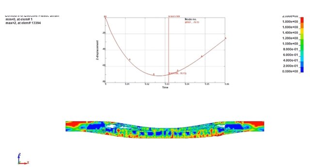 Simulated and validated NRC slab blast behavior using LS-DYNA (MAT_072R3). Tuned DIF and fracture energy to match experimental displacement (36 mm). Focused on dynamic rate effects, energy dissipation, and model calibration.