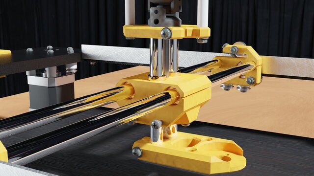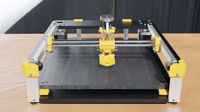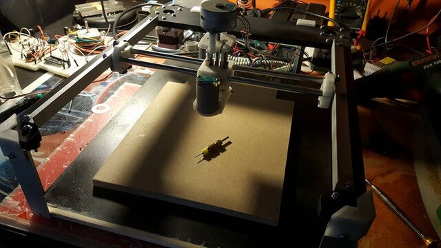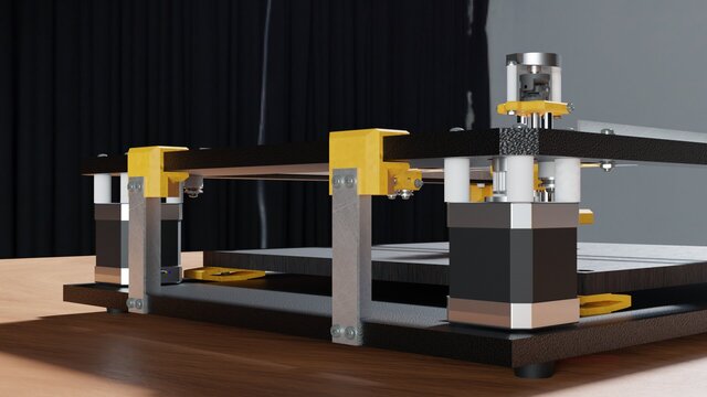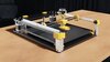 CoreXY engraver made using cheap aluminum profiles and a minimum of 3D printing. Surprisingly, a standard T aluminum profile works great with steel V groove rollers.