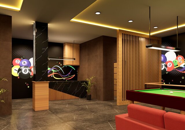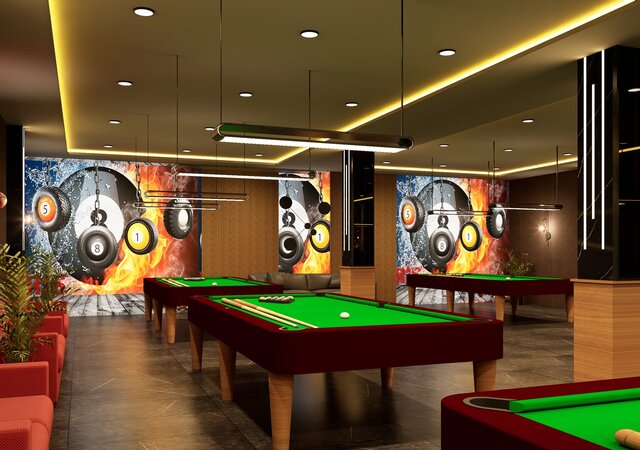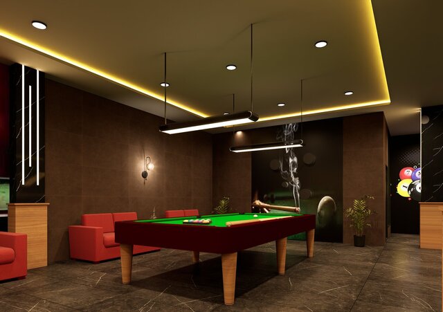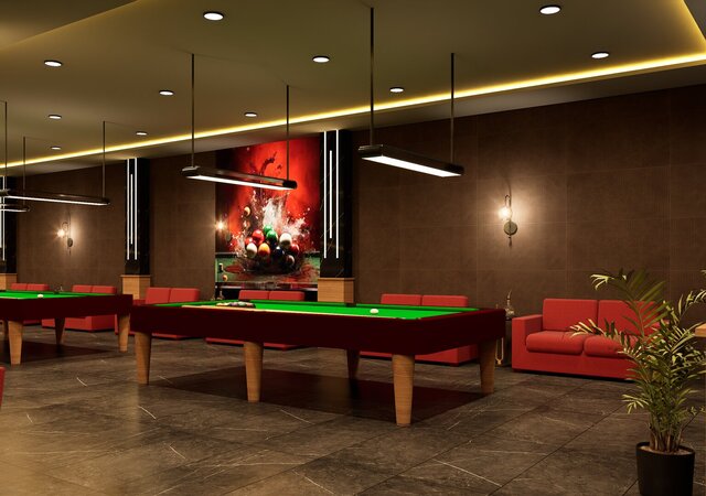 The snooker club is designed with a modern and contemporary approach, featuring a dark theme that creates a warm and cozy atmosphere. Accent lighting on the exterior walls and carefully selected wallpapers enhance the overall ambiance. LCD screens are provided for entertainment, along with a café facility, offering users a comfortable and enjoyable leisure experience.
