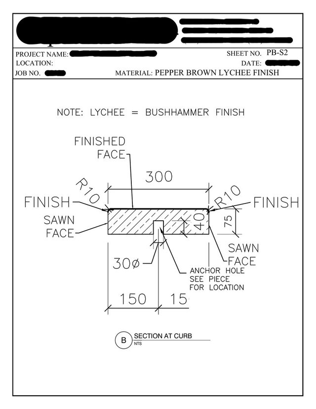 Example stone fabrication drawings with example shop ticket sheet. Client's name and project redacted.