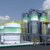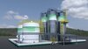 Rendered image of a bulk product storage tanks project, containing a photorealistic image of 4 stainless steel tanks with a brushed finish and 2 painted carbon steel tanks, with drainage and supply lines, pump house, access stairs, and containment basin.