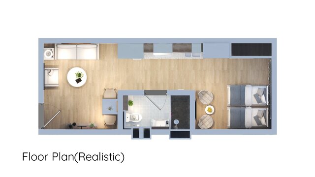 A studio apartment, or studio flat, is a living space containing a single main room, plus a bathroom. The main room functions as the kitchen, living room, office, and bedroom for the unit, with no walls separating the rooms.