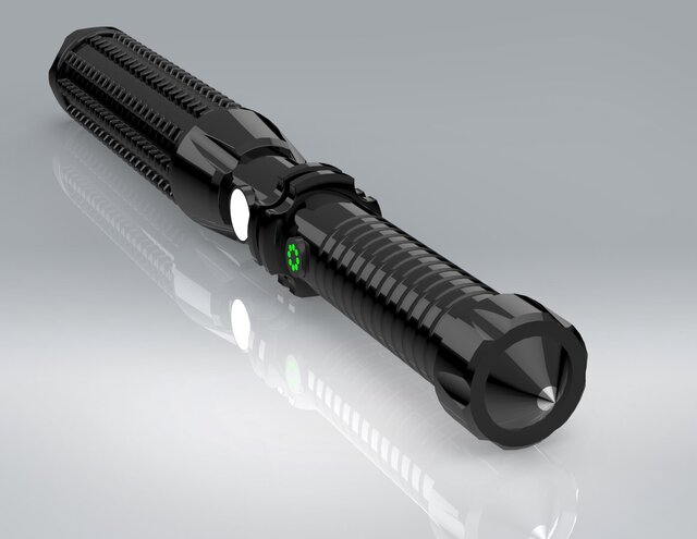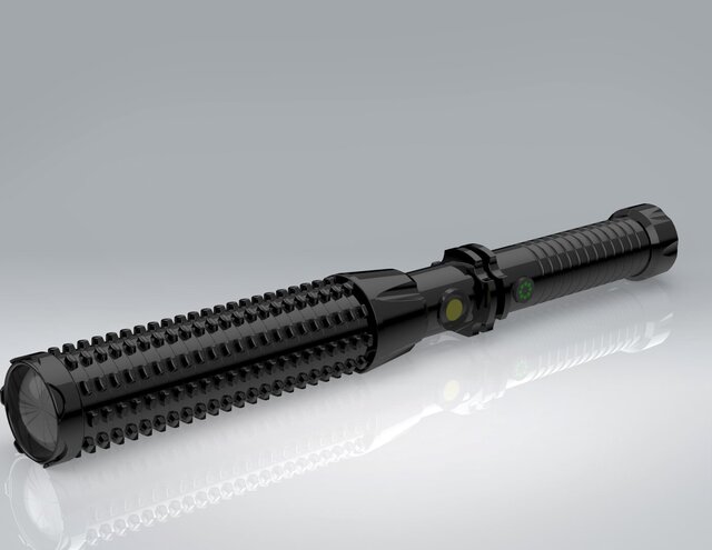 Exact replica of high lumen torch with stun gun device having multiple safety features. Designed for manufacturing purpose.