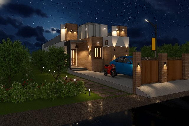 This elegant modern residence showcases a perfect blend of brick cladding and smooth contemporary design. The façade combines earthy tones with strong geometric lines, enhancing both strength and warmth. Ample outdoor space, natural greenery, and soft pathway lighting bring serenity and sophistication to the overall look. Designed for those who appreciate simplicity with style, this home is a statement of modern living.