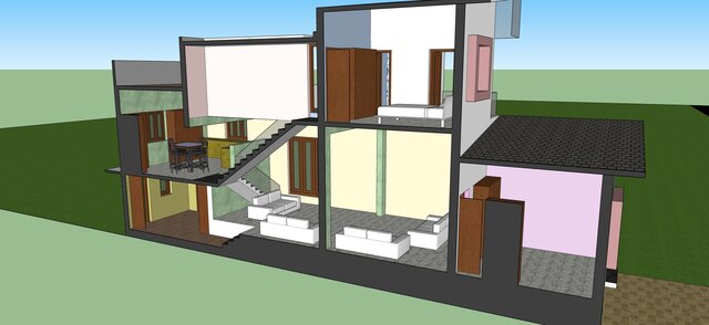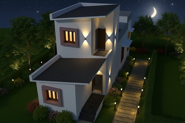 This modern duplex residence blends simplicity with elegance. The asymmetric roofline adds architectural interest, while the pastel accents soften the structure’s look. Surrounded by a landscaped garden and pathway lighting, the design promotes comfort, functionality, and aesthetic appeal in limited space.