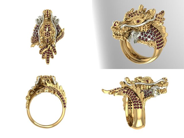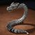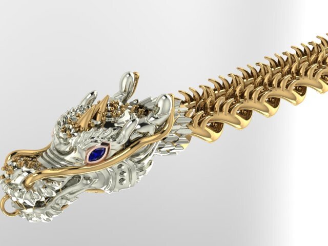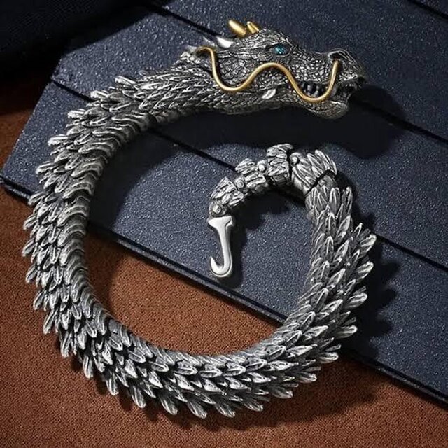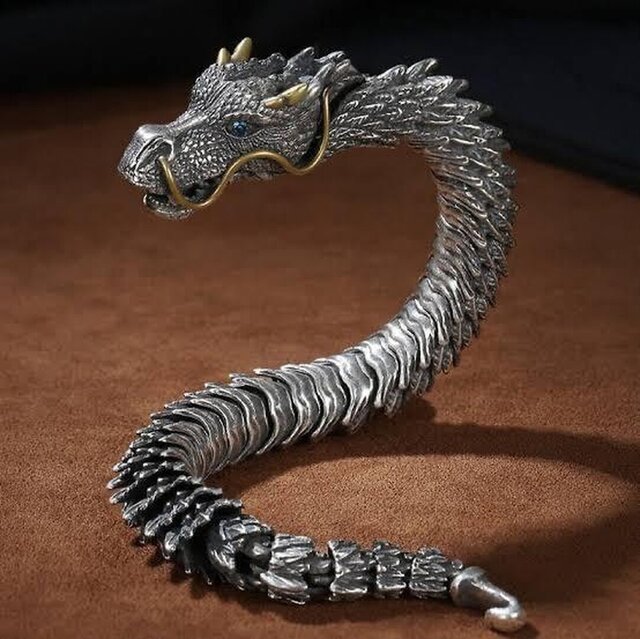 Dual-Metal Design: Features a sculpted silver mechanical dragon head with striking blue gemstone eyes and integrated gold filigree. The articulation is inspired by both biological form and kinetic engineering.
