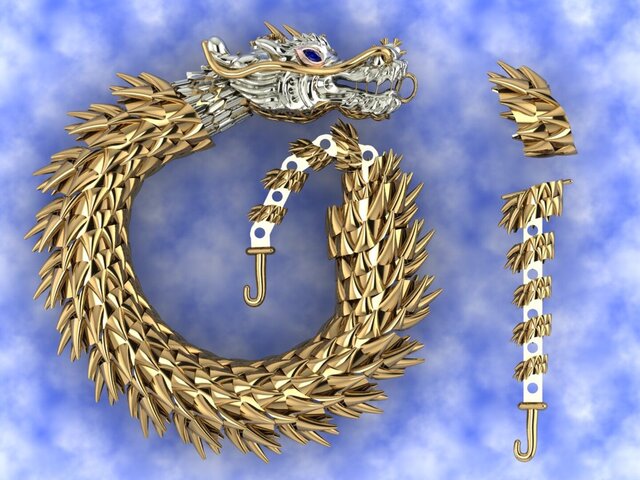 Aesthetic Context: The image shows this complex design against a vibrant, stylized blue sky-and-cloud backdrop, emphasizing its celestial or 'cloud-flying' dragon theme.