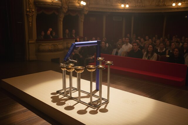 The singing bowls are arranged in a precise, tiered arc designed for both acoustic performance and spatial efficiency: