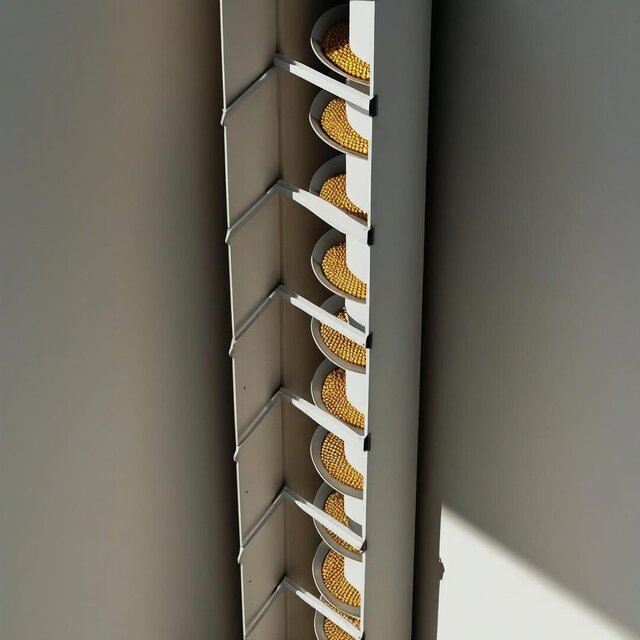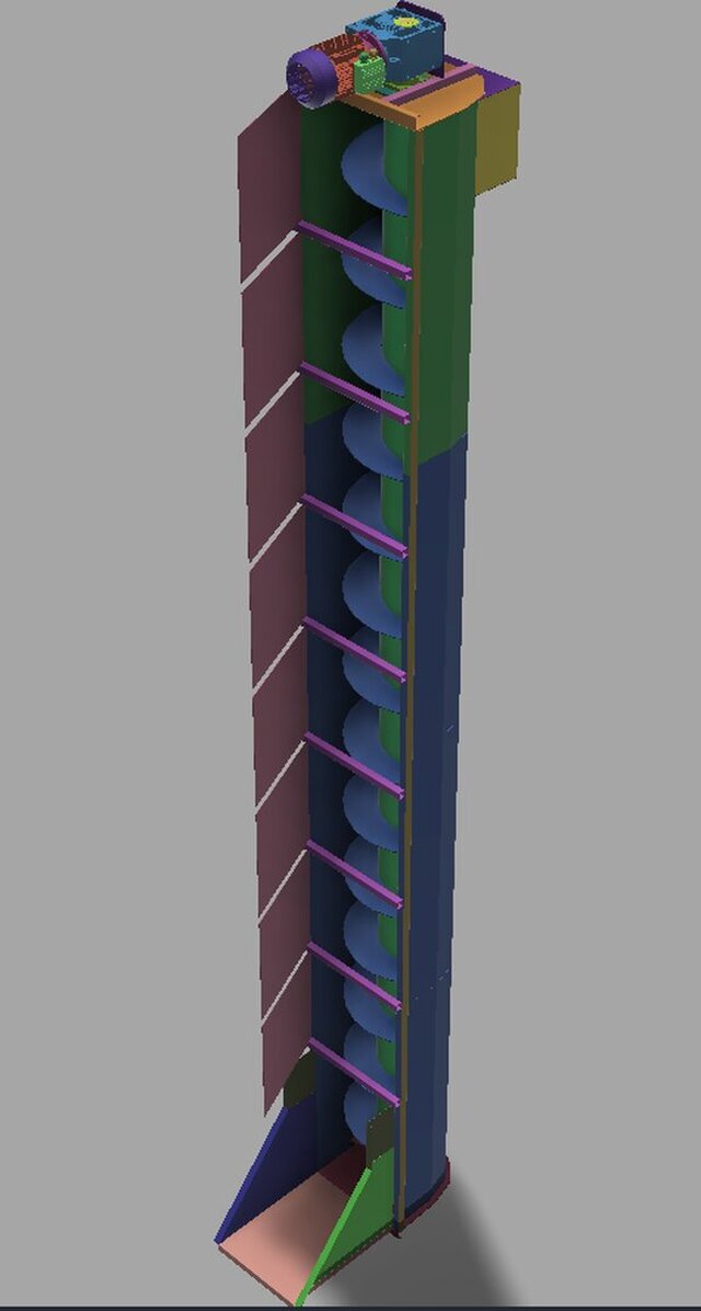 A production-oriented screw conveyor system powered by an electric motor, designed for transporting and sorting small components. Its layered structure ensures high efficiency.