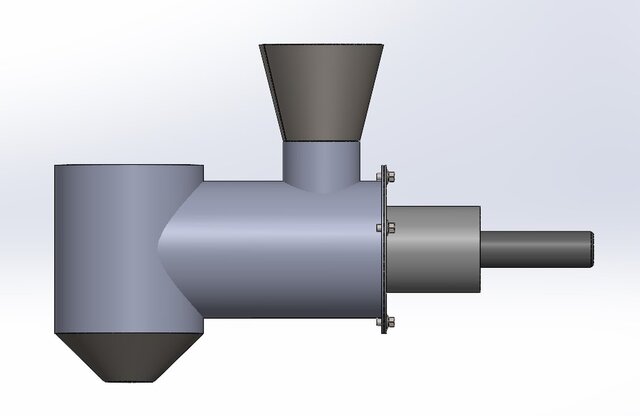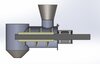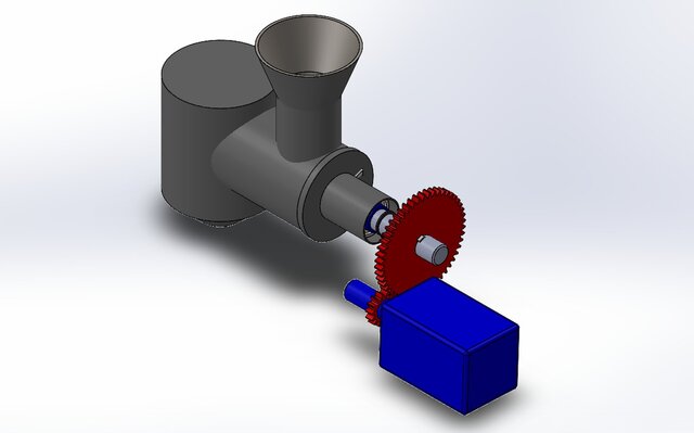 A volumetric food dispenser that uses a food machine screw to mix then dispense the food onto the next stage on the production line. The volume dispensed is controlled by controlling the outlet (on/off) and by controlling the motor that rotates the main shaft.