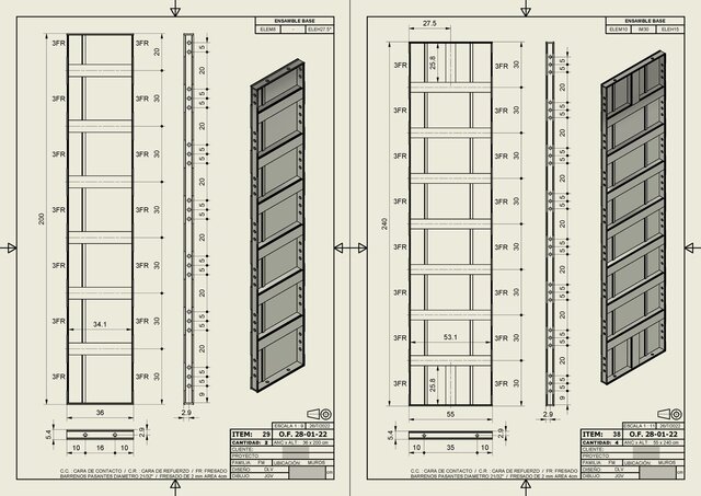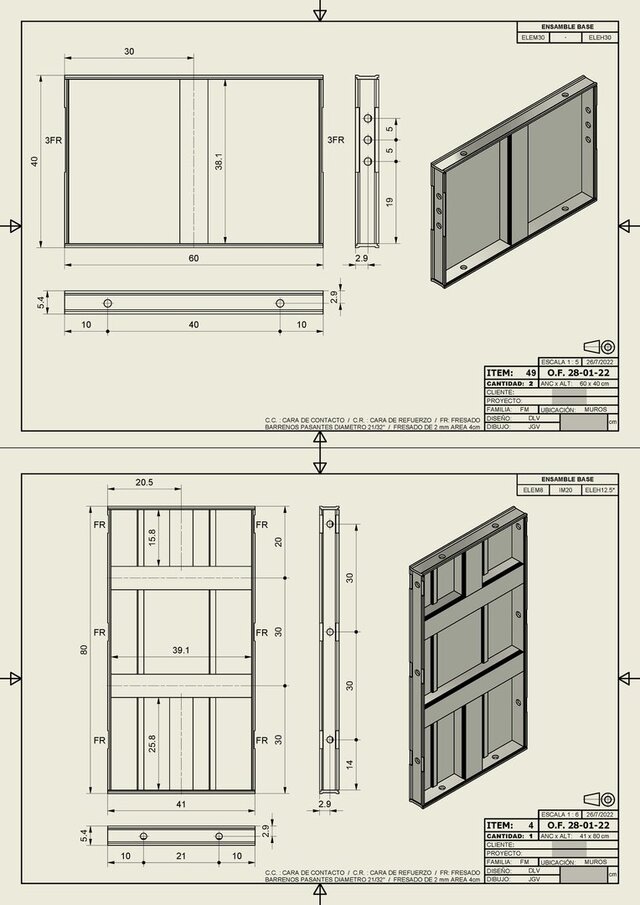 Wall formwork systems are designed to build complete house perimeters using poured concrete, ensuring dimensional accuracy and structural continuity. These formworks were modeled in 3D in Autodesk Inventor using the iLogic tool, enabling automated configuration. Through a custom dialog box, the user can input parameters that modify dimensions, machining features, and components according to the specific position each formwork will occupy within the perimeter. This parametric approach allows adaptation to different architectural designs, optimizes manufacturing, and reduces on-site preparation time.