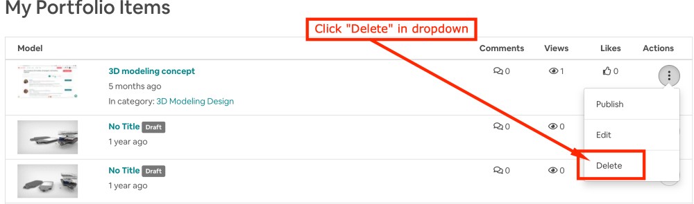 How can I delete a 3D model or portfolio item in my profile? You can delete 3D models or portfolio items by visiting My 3D models > click dropdown > select “Delete“